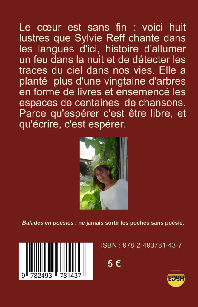 Le cœur est sans fin : voici huit lustres que Sylvie Reff chante dans les langues d’ici, histoire d’allumer un feu dans la nuit et de détecter les traces du ciel dans nos vies. Elle a planté  plus d’une vingtaine d’arbres en forme de livres et ensemencé les espaces de centaines de chansons. Parce qu’espérer c’est être libre, et qu’écrire, c’est espérer.
